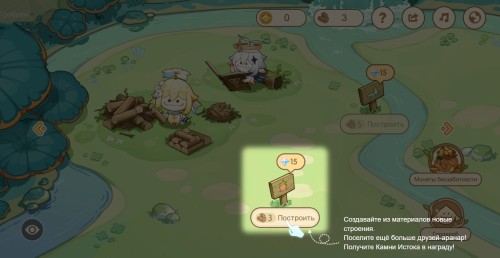 Для появления аранар вам нужно будет строить различные постройки, тратя на это определенное количество строительных материалов (бревен) и получая в награду примогемы. Стройматериалы можно добывать путем выполнения ежедневных заданий (кликните на аранару в виде главного героя), большинство из которых связаны с игрой.