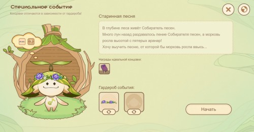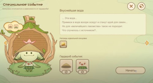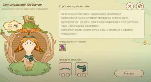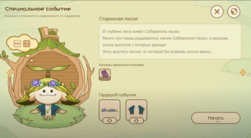 Его идеальный наряд состоит из бело-зеленой шапки с листком и оранжевого банта. Для обычной концовки достаточно снять любой из комплектов одежды. В награду вы получите строительные материалы х3 и 25 тысяч моры.