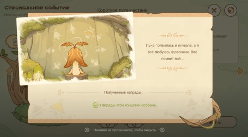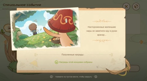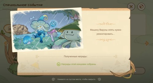 Посмотреть все арты можно в Альбоме события, кликнув на Паймон в виде аранары. Он подскажет вам, какие концовки вы пропустили.