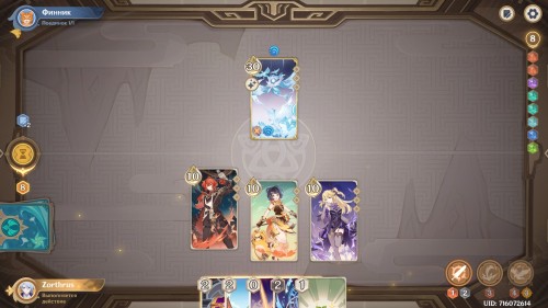 Компанию же им может составить персонаж Син Цю, что позволит вам часто вызывать мощную реакцию Таяние. Что касается выбора первого активного персонажа, то делайте им того, чья карта талантов вам выпала в стартовой руке. В ином случае советуем начинать с Син Цю, чтобы поскорее наложить на врагов Гидро статус.
