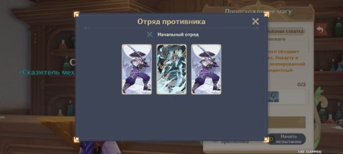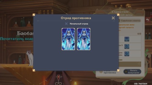 Если вы уже прошли предыдущие испытания, можете собрать команду монстров: Лавачурл (у него всего 8 ХП, но крепкий щит), Зеркальная дева/Родия и Пиро агент. Две последние карты способны создавать сильную реакцию «Пар». Помимо этого, агент снижает получаемый урон элементальным навыком, Родия может призывать помощников для щита/дополнительного урона, Зеркальная дева может повысить свой элементальный урон.