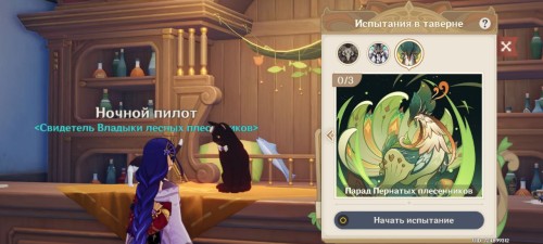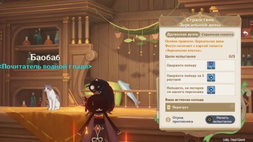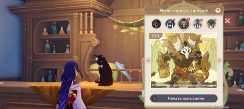 Прокачавшись, отправляйтесь в заведение «Кошкин хвост», расположенное в городе Мондштадт, и поговорите там с черным котом Принцем. Затем выберите опцию диалога: «Начать испытание в таверне». В результате вы сможете взяться за первую дуэль с котом.