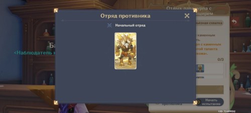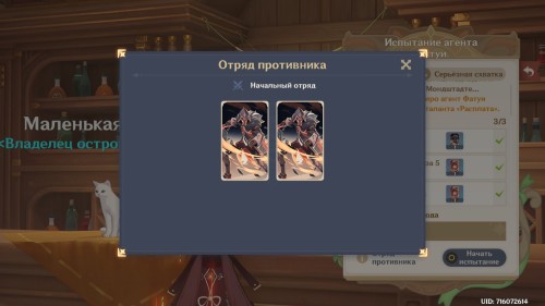 - Награда за победу: карта персонажа «Фатуи: Пиро агент» и карта таланта «Расплата»