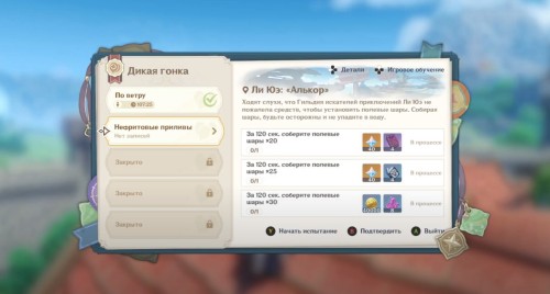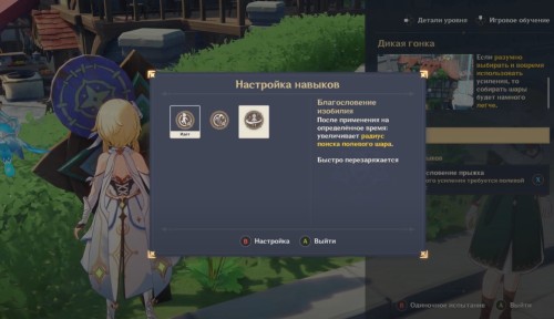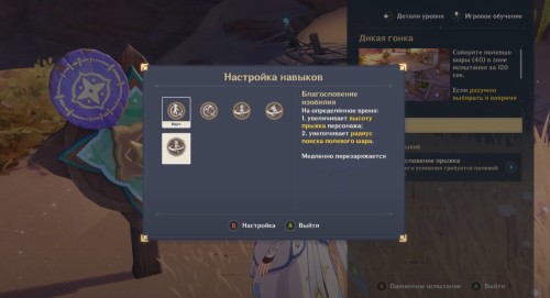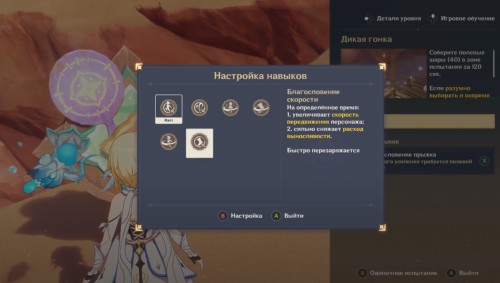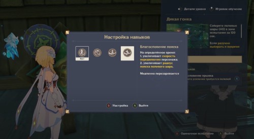 Первый маршрут построен прямо в столице Мондштадта. Вам необходимо будет собрать 40 полевых шаров за 120 секунд. Первым делом вам предстоит выбрать один из трех предложенных навыков. Если учесть, что вам придется бегать по крышам зданий, то мы советуем взять Благословение прыжка или ветра.