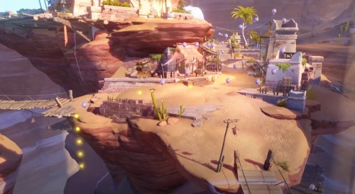 Соберите шар сонара, чтобы вызвать шарики урожая. Используйте благословение изобилия, дабы запрыгнуть на крышу здания, похожего на башню и расположенного с правой стороны. Соберите на нем все шары, а потом запрыгните на следующую постройку с шариками.