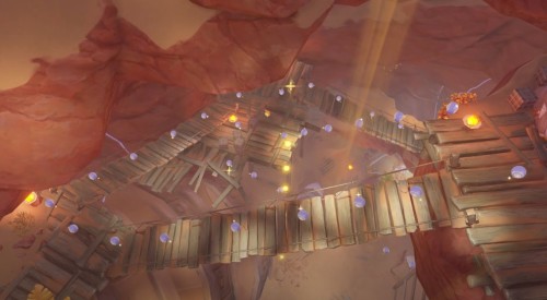Пройдя через первый мост, продолжайте бежать к следующему висячему мостику. Пересеките его, собрав шарики. Добежав до шара сонара, пока что не активируйте его. Вместо этого поверните камеру наверх и используйте четырехлистник, чтобы снова подняться наверх.