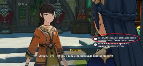 К счастью, ответ не влияет на настроение исследовательницы, а лишь на ее диалог. Однако первый вариант можно назвать более правильным, ведь именно так обычно говорила Набия. Второй же выбор рассмешит Сетарию – она отметит, что новая приговорка показалась ей забавной.
