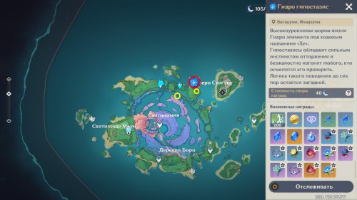 Телепортируйтесь на север острова Ватацуми, что находится на территории Инадзумы. Гидро гипостазис расположен под землей, куда можно попасть либо со стороны моря возле водопада, либо со стороны острова через едва заметный проход.