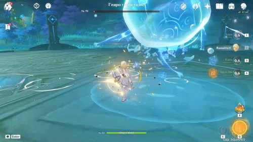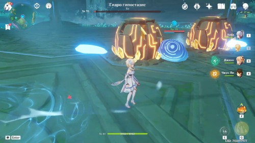 В отряде вам обязательно понадобится Гео Путешественник, кометы которого будут блокировать путь каплям. Если у вас герой прокачан, предварительно снимите с него все артефакты и поставьте на персонажа слабый меч, чтобы ненароком не убить водные пузыри при установке барьеров.