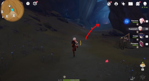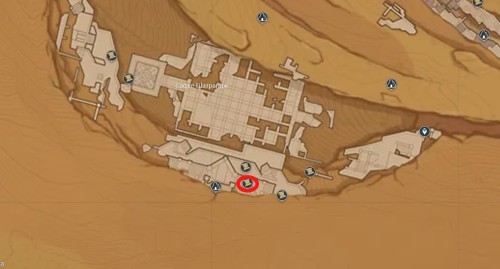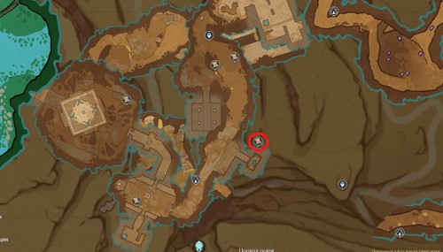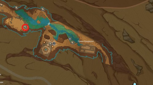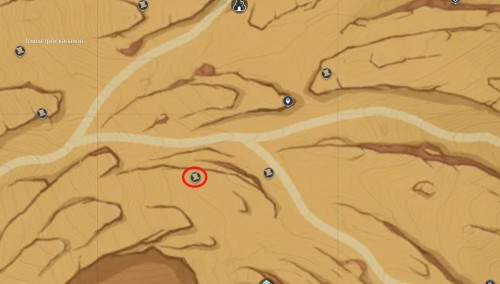 От подземного телепорта в отмеченной области двигайтесь на северо-запад. В просторной пещере вы обнаружите кучу камней возле стены, которую необходимо уничтожить. За ней вы найдете Дендро монумент и каменную табличку.