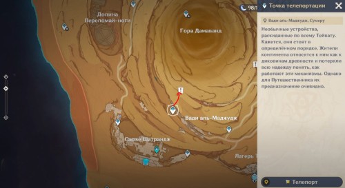 Переместитесь к восточному телепорту Вади аль-Маджудж, а затем начните двигаться на север, используя четырехлистные символы. Спуститесь с утеса и держитесь подножья горы Дамаванд, пока не дойдете до руин, где установлен монолит. На гифке ниже показан полный маршрут.