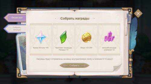 Правильно сопоставив все 6 книг, вы сможете забрать награды в разделе списка книг. Вы получите 40 камней истока, 3 фрагмента изумруда Нагадус, 20 тысяч моры и 2 волшебной руды усиления.