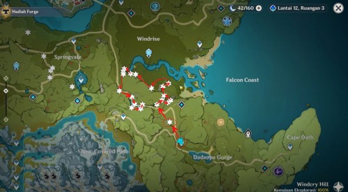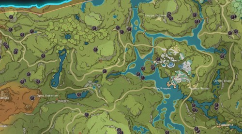 Первым делом переместитесь к телепорту возле озера Лухуа и спланируйте вниз к побережью, чтобы найти пару месторождений. Далее бегите на северо-восток и отыщите еще несколько залежей возле каменистых выступов.