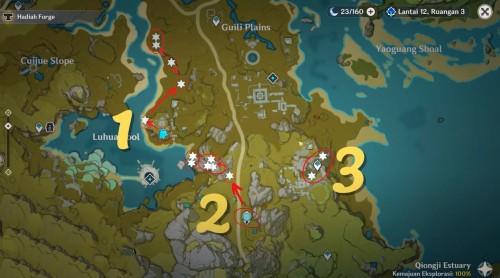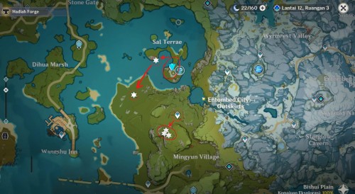 В конце переместитесь в руины Долины Гуйли и отыщите залежи у подножья скалы. Если вы следовали всем указанным маршрутам, то на данный момент должны будете собрать 162 обломка железа. Если вам этого будет недостаточно, то можете посетить другие локации, отмеченные ниже.