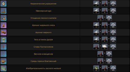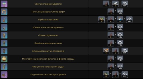 Печь искателя Адептов | Пламенное масло х1 + Кристальное ядро х2 + Обломки железа х2 + 500 моры + 10 секунд | Дает возможность разместить на земле полевую кухню для готовки различных блюд. |