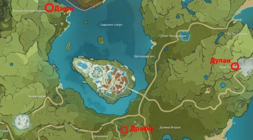 - Мондштадт: Драфф (Спрингвейл), Дулан (Храм Тысячи ветров) и Дэвис (Каньон Светлой короны)