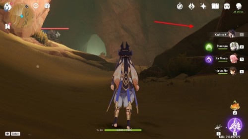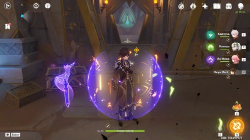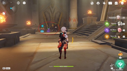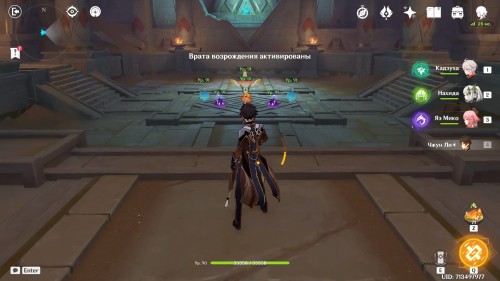 В новой комнате вас ждет новое испытание, на этот раз боевое. Активируйте его и расправьтесь с двумя волнами слаймов и хиличурлов.