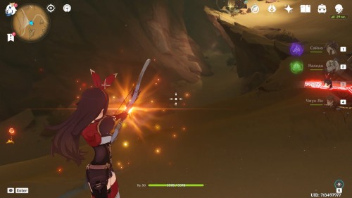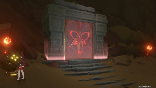 Впереди вы сможете увидеть пока еще заблокированный данж. Чтобы его разблокировать, нужно будет в любом порядке зажечь четыре расположенных рядом факела. Если у вас в отряде нет Пиро персонажа, то возьмите героя этой стихии, чтобы разгадать загадку. С этой задачей прекрасно справится Эмбер.