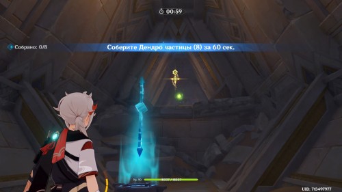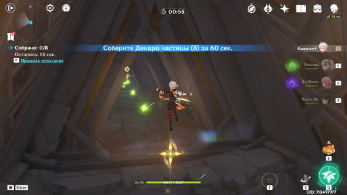 Суть испытания – за минуту собрать 8 Дендро частиц. Пользуйтесь быстрым перемещением по четырехлистным клеверам, чтобы уложиться в отведенное время.