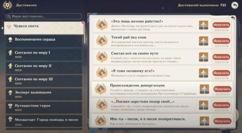 Добавим, что саму ачивку на экране вам могут не показать, однако вы все равно получите ее. Откройте страничку с достижениями, перейдите на вкладку «Чудеса света» и получите награду за открытие трофея «Происхождение дивергенции» в размере 5 примогемов.