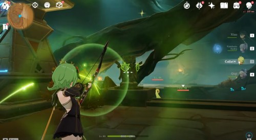 Теперь переключитесь на Дендро персонажа – подойдет и бесплатный Путешественник, однако мы советуем взять лучника, например, Тигнари или Коллеи. После этого ударьте по всем пяти стихийным тотемам Дендро атаками. Судя по всему, их можно активировать в любом порядке. На скриншотах ниже показаны все столбы.