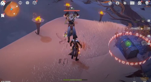 Поднимитесь на утес возле края карты, и вы обнаружите здесь обычный сундук и несколько факелов. Как только вы приблизитесь к ним, на вас тут же нападут двое элитных пустынников: Охотница ветров и Пылающий лед.