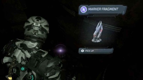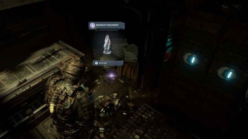 Однако прежде чем забрать его, поверните направо, и вы увидите фиолетовый светящийся объект на полке – это фрагмент маркера. Сразу взять его не получится, нужно сначала сбить полку с помощью атаки ближнего боя.