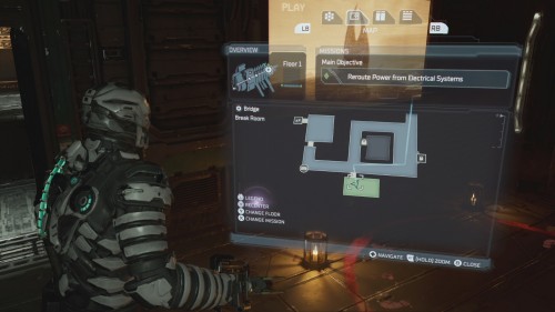 Выберите указанную цель и двигайтесь за маркером. Вы спуститесь на лифте на 3-й этаж моста (Bridge). Оказавшись там, найдите комнату отдыха (Break Room) на карте – это самое южное помещение. Идите в данную локацию, и отыщите часть монолита на полу.