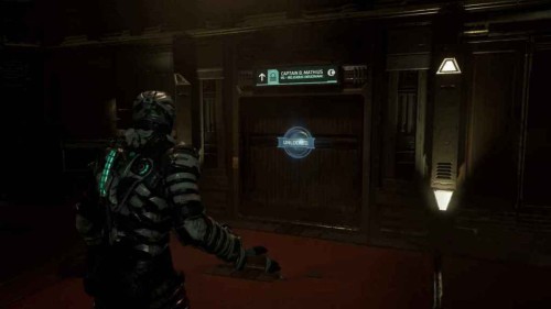 Пройдите по верхнему уровню, пока не увидите дверь с надписью «В административные помещения» (To Executive Quarters). Как только окажетесь там, пройдите еще через пару дверей и следуйте по единственному пути, пока не дойдете до большой комнаты. Слева от вас будет дверь с надписью «Капитан Б. Матиус» (Captain B Mathius) – туда-то вам и нужно попасть.