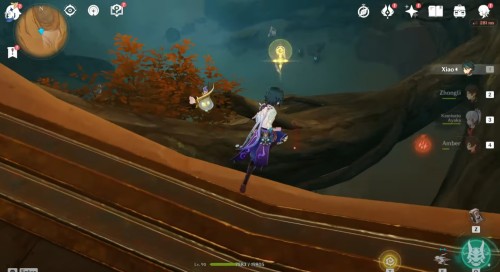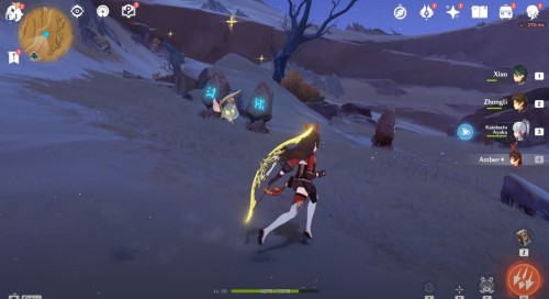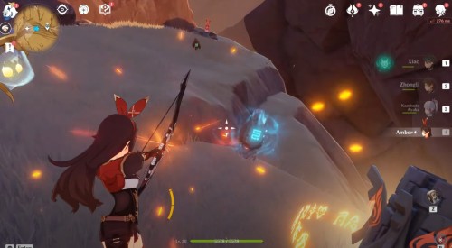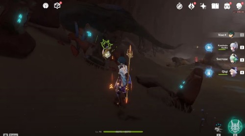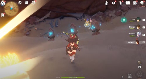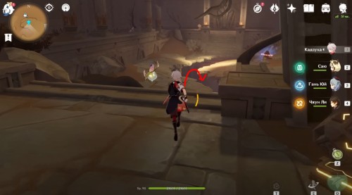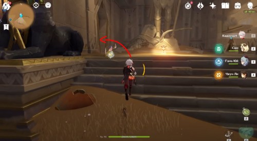 Переместитесь к указанному телепорту, а затем бегите вперед и спрыгните с обрыва вниз. Там вы обнаружите Пиро тотемы и заблокированный роскошный сундук. Для активации монументов вам нужно будет выставлять на обелисках правильные символы, показанные на скриншотах ниже.