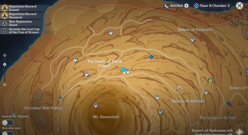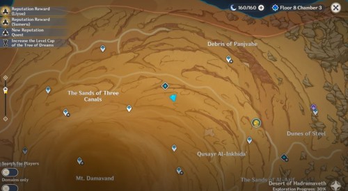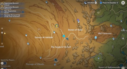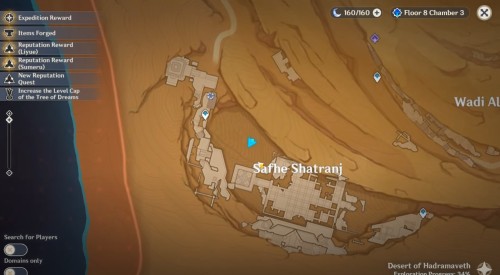Доступ к этой загадке открывается при выполнении задания «Храм, где пески текут, точно слезы». Отправляйтесь в отмеченную область. Здесь вы обнаружите 6 камней, стоящих вокруг заблокированного сундука. Подробнее о данном пазле мы рассказали в отдельном руководстве. Ниже на гифке показаны правильные символы.