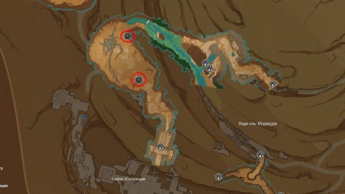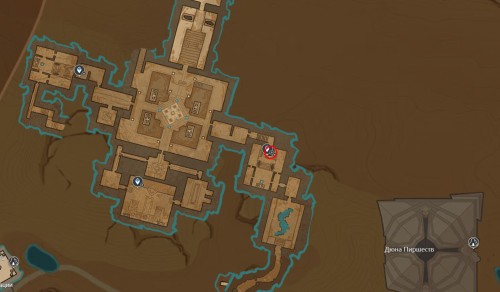 Загадка расположена под землей. Доступ в локацию открывается при выполнении задания «Храм, где пески текут, точно слезы». Переместитесь к указанному подземному телепорту, а затем пройдите вперед и сверните влево. Войдите в комнату впереди и поверните вправо в просторное помещение с большой трещиной на полу.