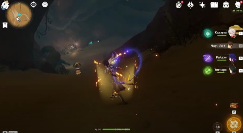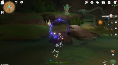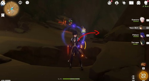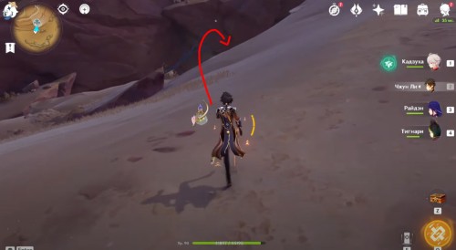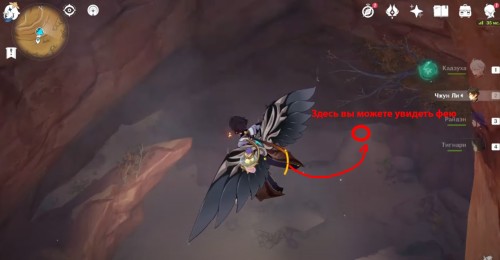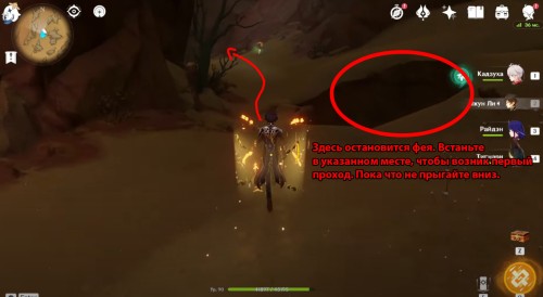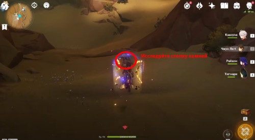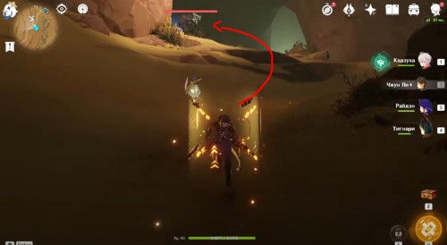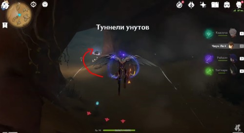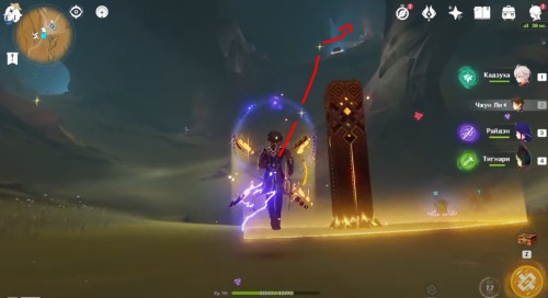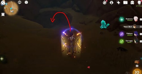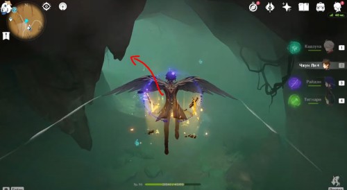 Активируйте тотем любым Анемо персонажем для вызова воздушного потока и создания прохода с ветряными кольцами наверху. Воспользуйтесь им, чтобы подняться на верхний уровень пещеры, где находится вход в подземелье «Город погибших».