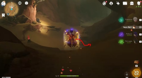 Спуститесь вниз, и вы обнаружите впереди проход, заблокированный лианами. Рядом с ним будет стоять Дендро тотем. Переключитесь на любого Дендро персонажа (подойдет и Путешественник), а затем ударьте по монументу стихийной атакой, чтобы активировать его и разблокировать путь, ведущий на арену с боссом.