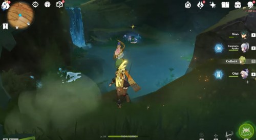 Теперь двигайтесь к водопаду, справа от которого вы обнаружите еще один стихийный столп. Его вновь будут охранять хиличурлы. Разберитесь с противниками и активируйте монумент.