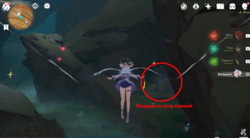 Используйте четырехлистные символы, дабы быстренько перелететь на правую сторону, где вы увидите большую кучу камней. Разрушьте ее (быстрее всего это можно сделать двуручным мечом или Гео атаками), чтобы возник второй стихийный тотем.