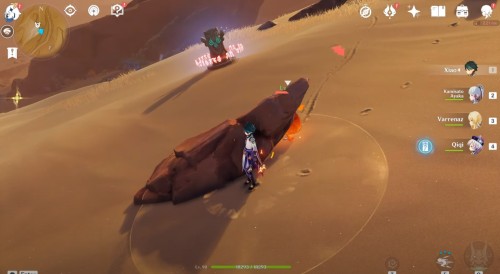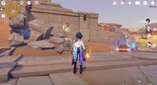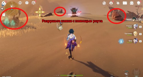 Чтобы разгадать эту загадку, вам необходимо будет разрушить эти булыжники с помощью находящегося здесь унута. Для этого вставайте возле камней, ждите, пока под вами не появится желтый круг, а затем убегайте. В результате вы разблокируете монумент – теперь ударьте по нему Анемо стихией для создания воздушного потока.