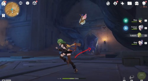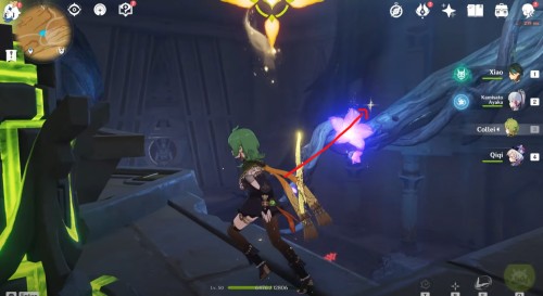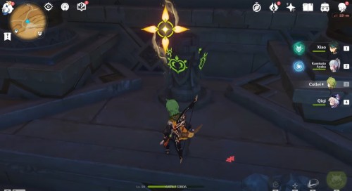 Пройдя через еще один коридор, вы попадете в помещение с дырой в полу. Поверните камеру наверх и притянитесь к четырехлистному символу слева, чтобы попасть к Дендро тотему. Активируйте его любой Дендро атакой. Теперь посмотрите на другую сторону, и вы увидите второй монумент – либо притянитесь к нему четырехлистником, либо активируйте издалека лучником.