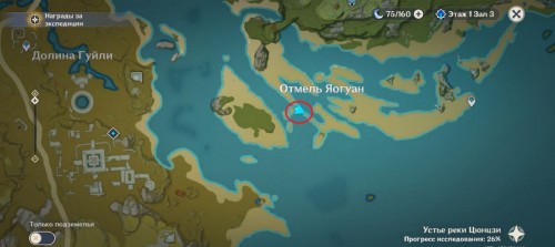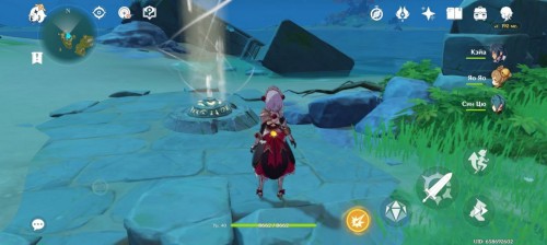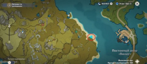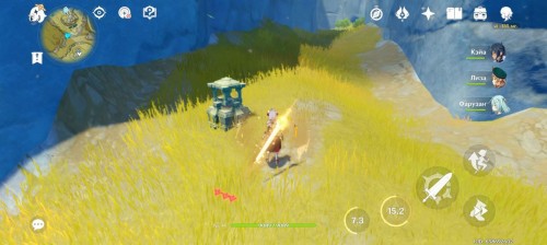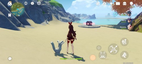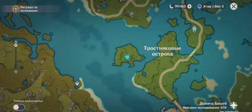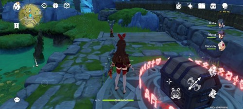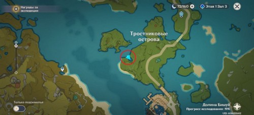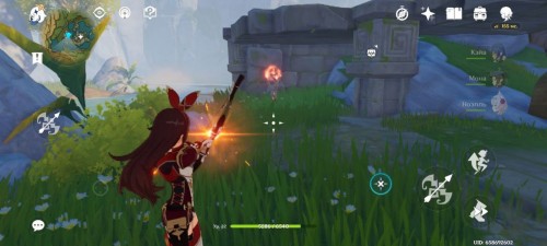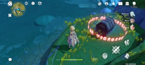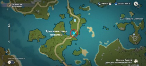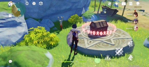 Пройдите в южную часть островов. Здесь, на камнях, стоят хиличурл и мишень. Для получения сокровища достаточно сломать мишень, убивать монстра необязательно.