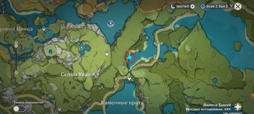 Плита находится в небольшом озерке в районе между Статуей Архонтов и «Ваншу». Сначала вам предстоит победить большого Крио слайма, чтобы получить доступ к головоломке – кроме того, вполне возможно, что на вас нападет геовишап. Активировав плиту, вы увидите сундук на подставке.