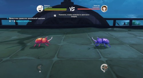 Далее вам нужно будет поучаствовать в учебном бою. Перед этим внимательно изучите инструкцию по сражениям с использованием жуков оникабуто. Теперь поговорите с Эликтрой, стоящим неподалеку, и начните сражение. Дебютный поединок довольно простой – нужно лишь следовать инструкциям, демонстрируемым на экране.