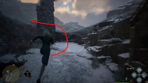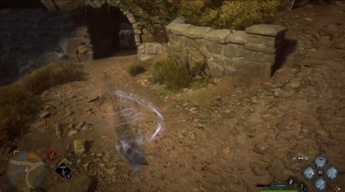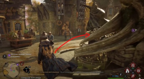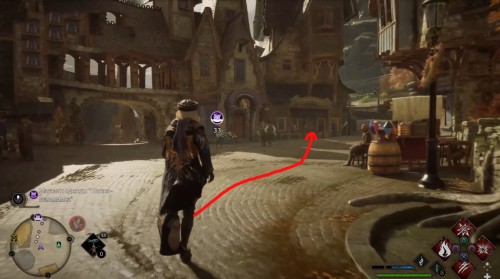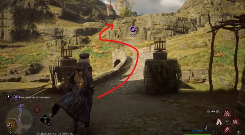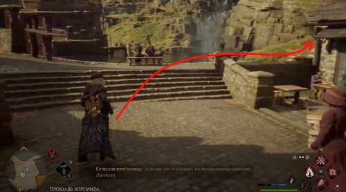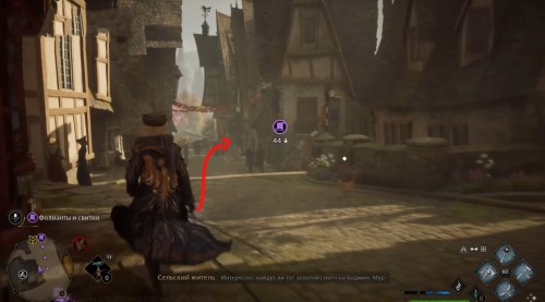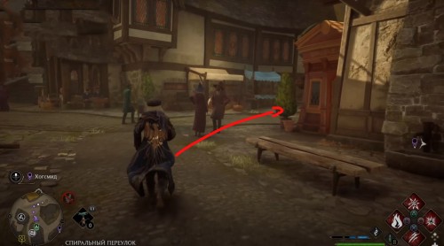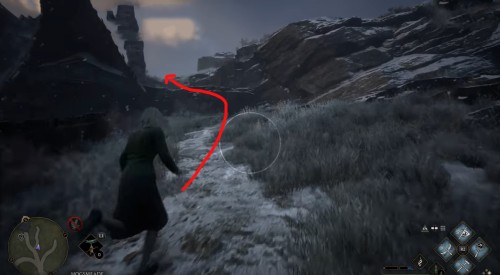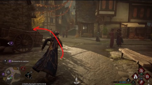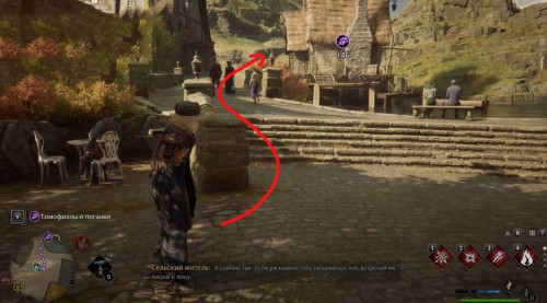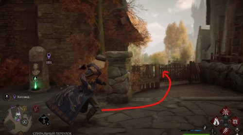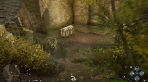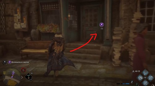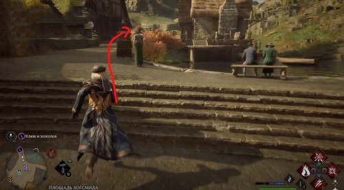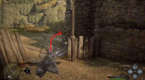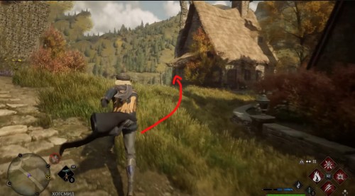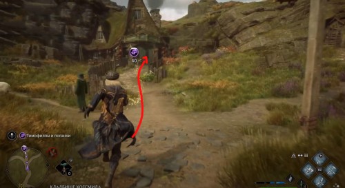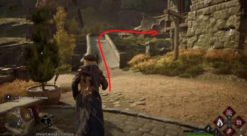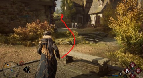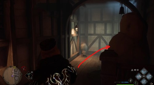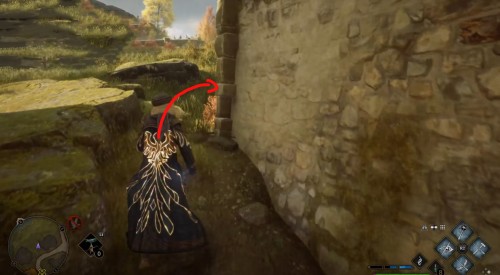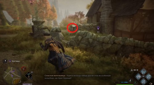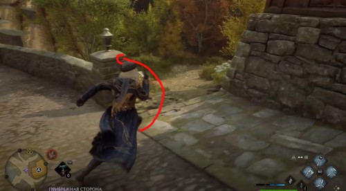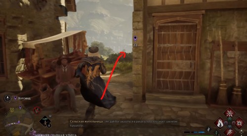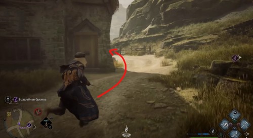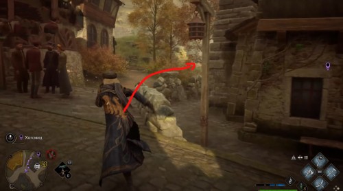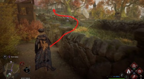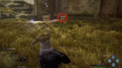 Переместитесь к отмеченной точке летучего пламени и бегите вперед к дому, стоящему чуть правее. Встав возле его угла, примените чары невидимости и пройдите направо, чтобы обнаружить сундучок.