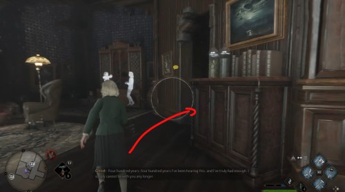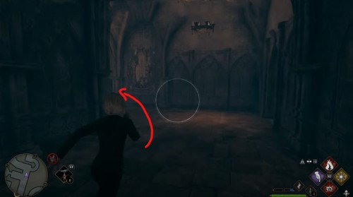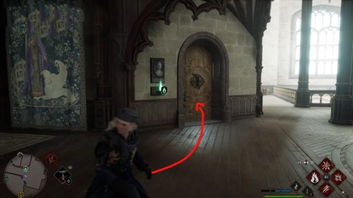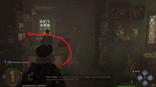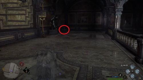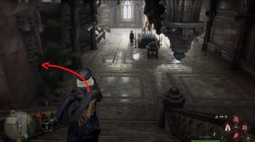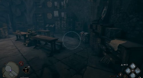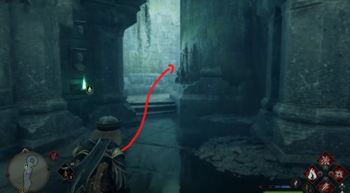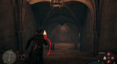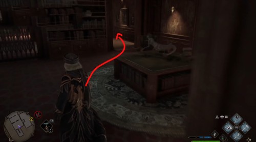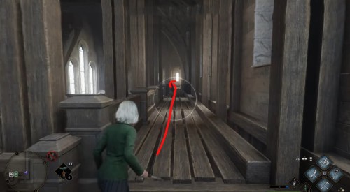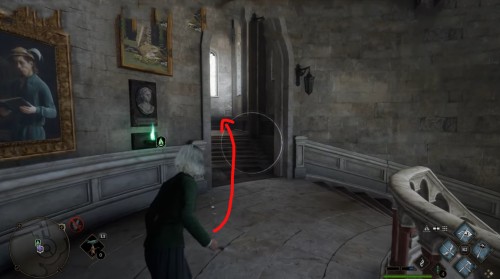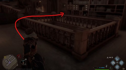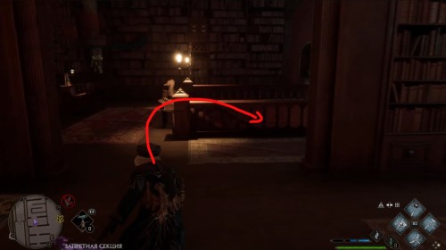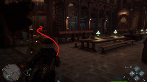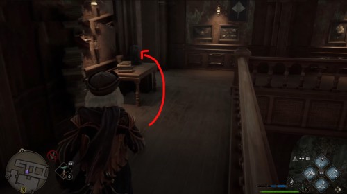 Сначала пройдите задание «Зал картографии». После этого направляйтесь в отмеченную локацию и поднимитесь по винтовой лестнице справа от зеленого пламени. Поднявшись, примените заклинание невидимости и пройдите в заднюю часть помещения. Там вы и найдете нужный объект.