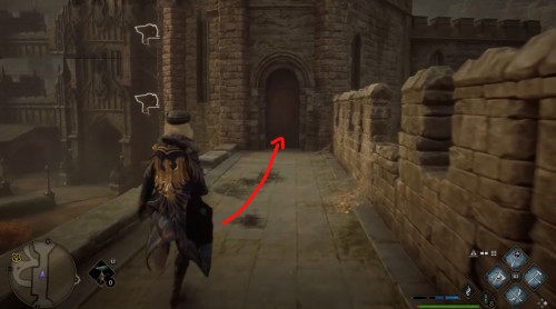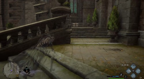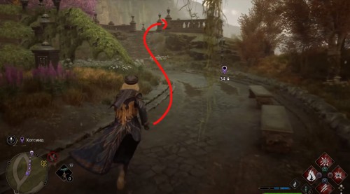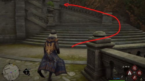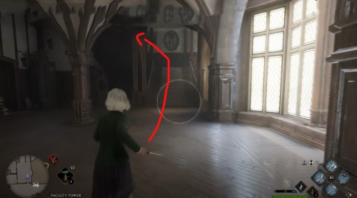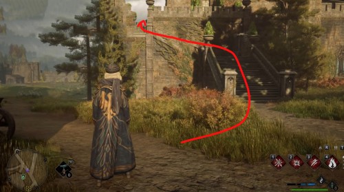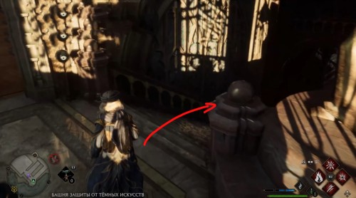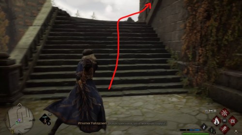 Телепортируйтесь в указанную локацию, а затем развернитесь, забегите во двор школы и сразу же сверните влево. Бегите вдоль стены и поднимитесь по лесенке наверх. Потом снова поверните налево и войдите в башню. Перед этим примените чары невидимости.