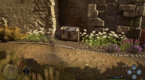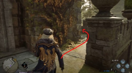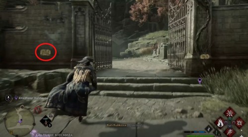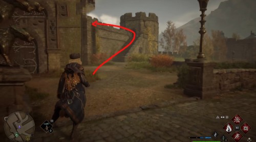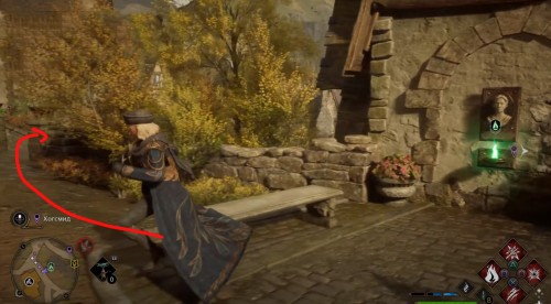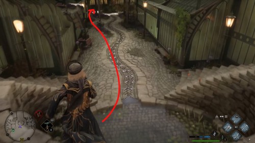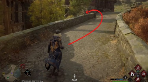 Отправляйтесь к отмеченной точке, пройдите немного вперед и сверните вправо. Двигайтесь вперед по улице, а затем опять поверните направо рядом с фонарным столбом. Идите вдоль каменной ограды и примените чары невидимости, так как вскоре вы увидите сундучок.