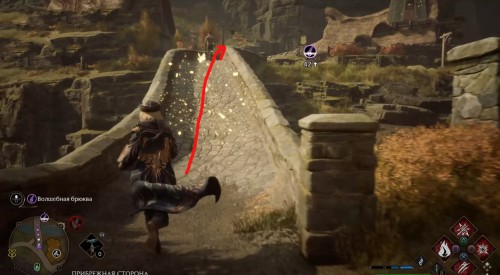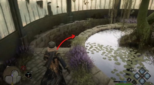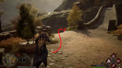Отправляйтесь в указанную точку, а потом поверните налево и пройдите по каменному мосту. Оказавшись на другой стороне, снова сверните влево и начните обходить дом. Когда увидите тележку слева, наложите на себя невидимость и подойдите к сундучку с глазом.