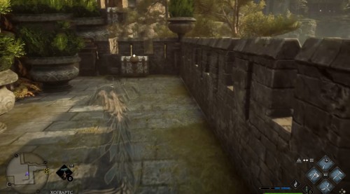 Телепортировавшись в отмеченное место, встаньте лицом к зеленому пламени и пройдите направо через деревянную калитку. Бегите вперед, перелезая через каменные ограды, и поднимитесь по лестнице. Используйте заклинание невидимости и отыщите сундучок возле перил.