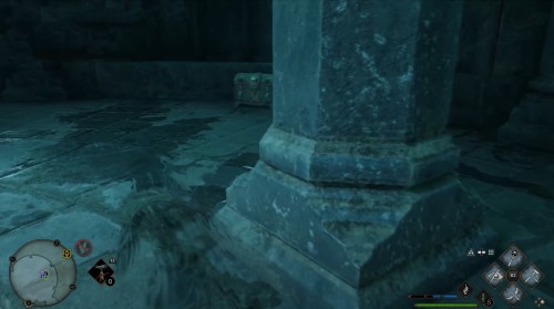 Телепортирвоавшись в отмеченную локацию, спуститесь вниз по лесенке и поверните влево. Далее поднимитесь по другой лесенке наверх к статуе кельпи. Прежде чем пройти в новое помещение, используйте невидимость. В левой части комнаты вы увидите глазастый сундучок.