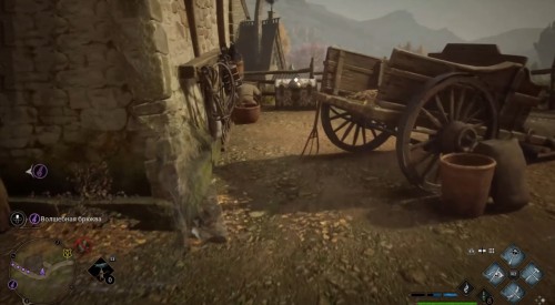 Перелезьте через каменную ограду и скастуйте заклинание невидимости. Далее приблизьтесь к сундучку, стоящему возле постройки и тележки.