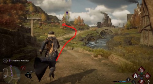 Отправляйтесь в указанную точку, поверните налево и пройдите по мосту на другую сторону. Далее поверните направо и бегите по дорожке наверх. Сверните налево к кладбищу и, прежде чем заходить на его территорию, скастуйте чары невидимости. Сундучок находится в левой части локации, позади склепа.